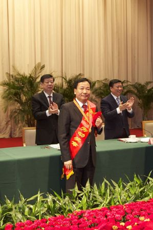 圖為全國五一勞動獎章獲得者---公司董事長劉保起同志在頒獎儀式上的情景